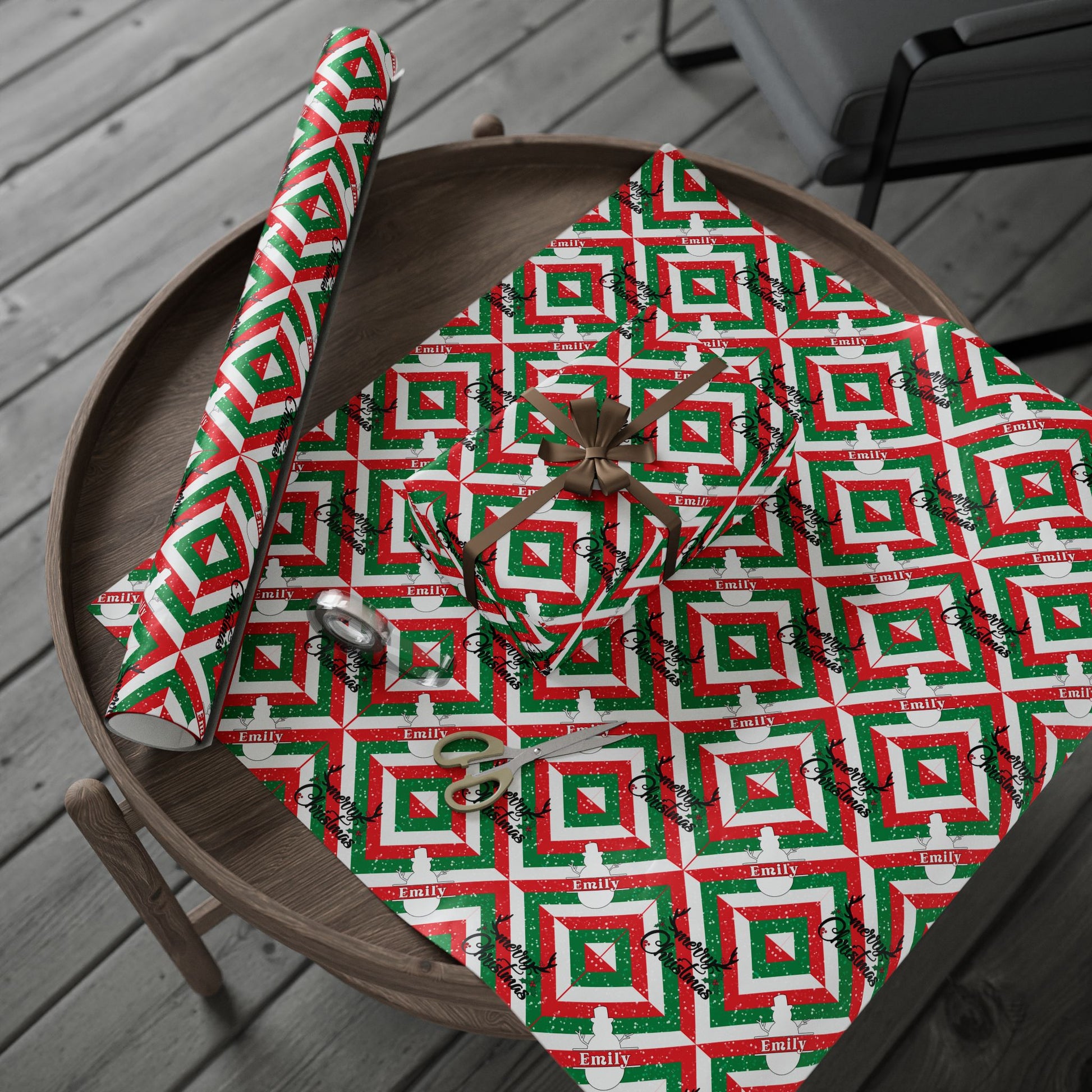 Red, White, & Green Snowman Custom Name Wrapping Paper (Emily)